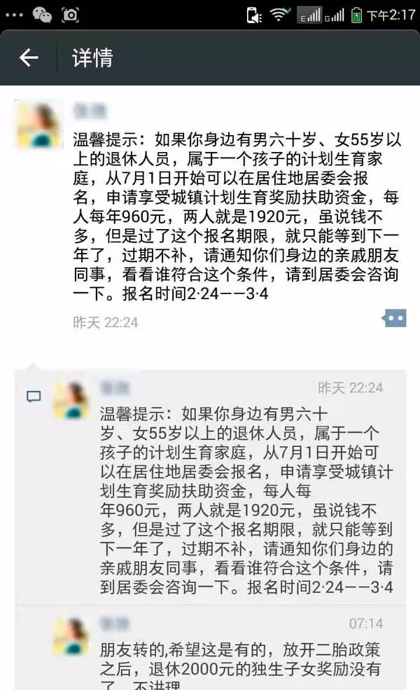 2月29日晚,辽源朋友圈中流传一条关于“申请领取城镇计划生育家庭奖励扶持资金”的消息。消息称:如果你是男六十岁、女五十五岁以上的退休人员,属于一个孩子的计划生育家庭,从7月1日开始可以在居住地居委会报名,申请享受城镇计划生育奖励扶助资金,每人每年960元,两人就是1920元。如果错过报名期限,就只能到下一年了,过期不补。报名时间2月24日-3月4日。