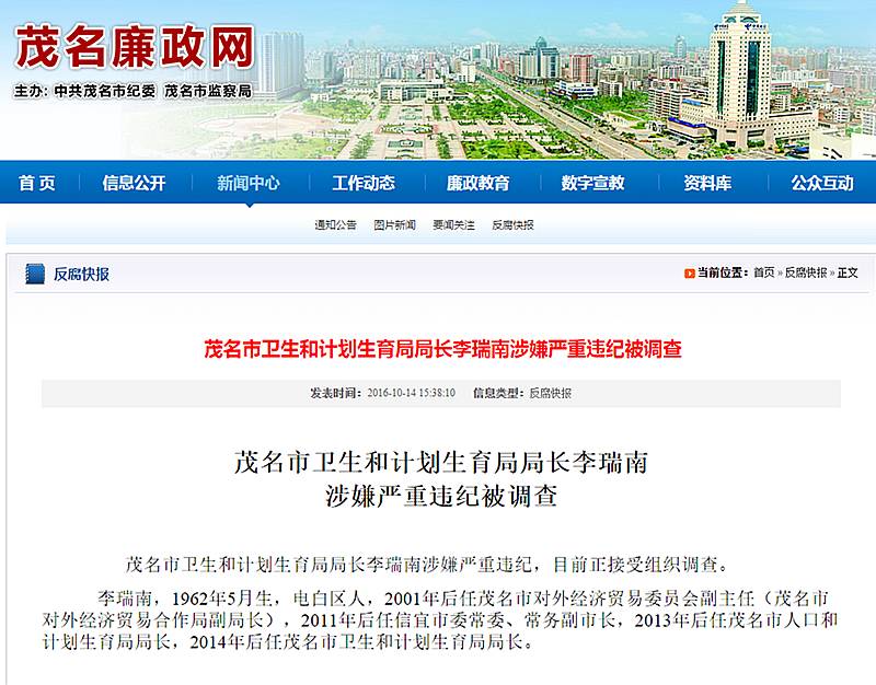 茂名市卫生和计划生育局局长李瑞南涉嫌严重违纪,目前正接受组织调查。