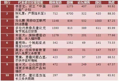 人民网舆情监测室经过数据统计和分析比较,梳理出今年全国“两会”开幕以来引起广泛关注和讨论的代表委员十大议案提案。与往年相比,今年的议案提案更加靠谱(雷人提案明显减少)、更加环保(两份提案剑指“雾霾”)、更加务实(建议更具体,操作性更强),网民的满意度显著提高。