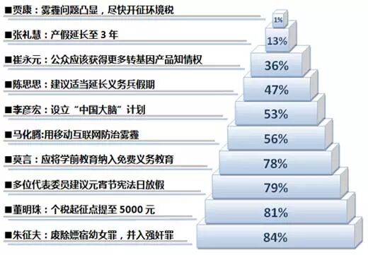 (说明:针对每一提案随机选取300名网友的评论,并根据评论内容分为赞同、反对及其他,满意度为赞同人数所占的百分比。因随机选取,或存在一定的误差。)