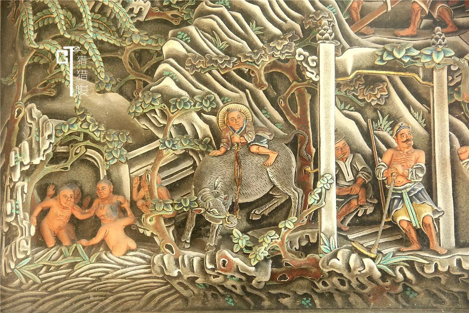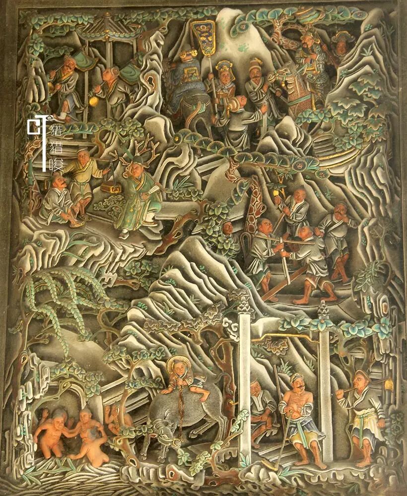 最有名气的是“小小牵牛绳”的故事。据说,这条细小的绳,难倒了不少工匠好手。猎猎唆寻觅许久,终于发现了牵牛绳子就在“士农工商”这雕版中,你有没有看到一个牧童,趴在牛背牵牛的,手中持的那条悬空牛索?