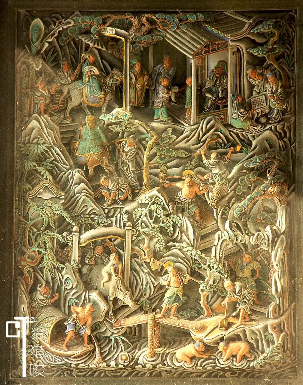 先来看“渔耕樵读”的石雕图,这里面有23个人、1头牛、2匹马。我们可以看到,小公子和书童去见监考官,三个老人在安闲地下着棋,樵夫在砍柴、担柴,牧童骑在牛背上,牛夫赶着牛,渔夫撒网捕鱼,两小儿则怀抱锦鲤、赤身捞鱼,农夫扛着锄头过桥,还有路人甲在提着烟枪在抽。他们有的隐身在山林曲径中,有的伫立在亭台楼阁上,神态动作,栩栩如生。真想不明白渔夫手里的渔网那么细密,是何等细致的雕刻工艺才能做到!