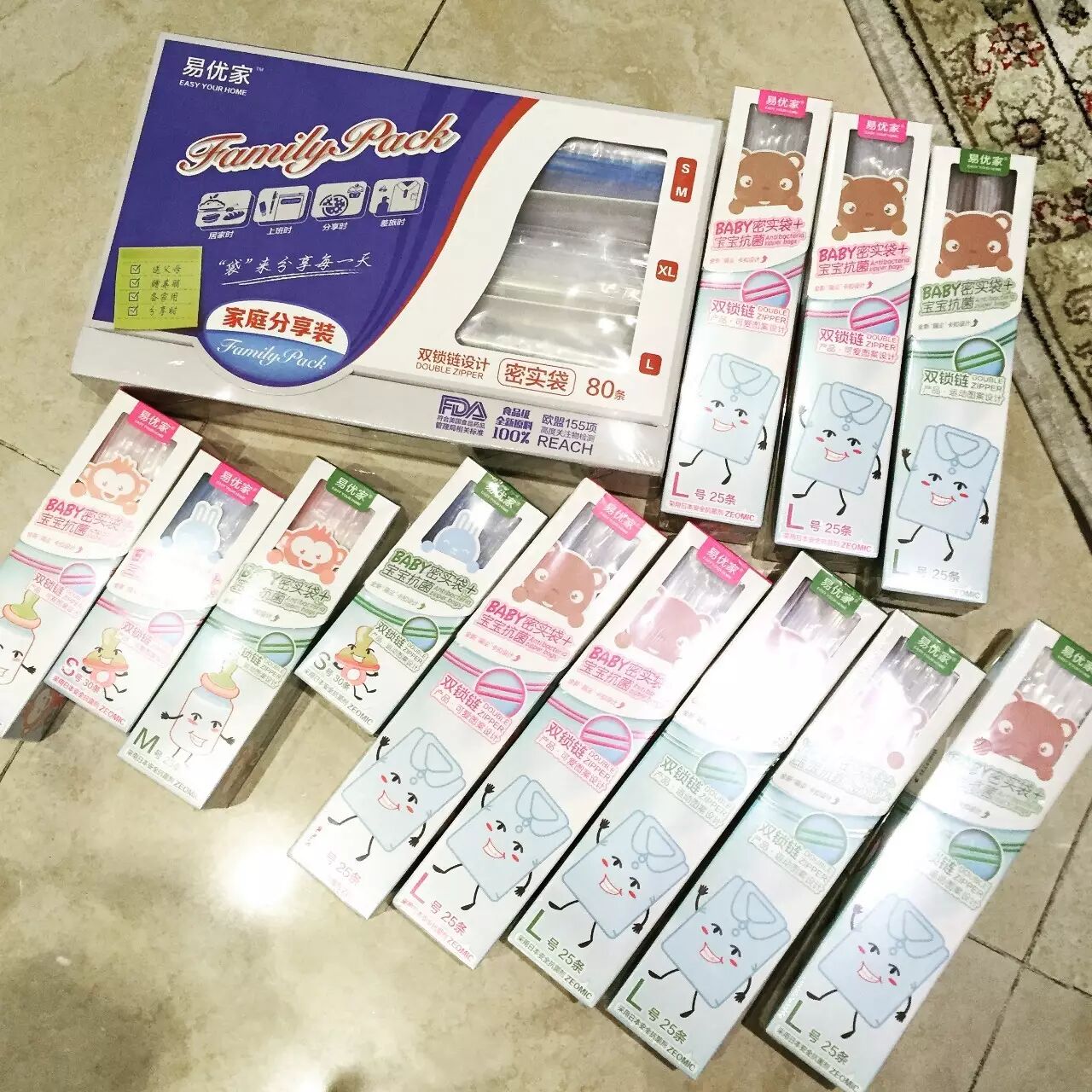易优家这个牌子特别好,我家平时放食物的塑封袋也是这个牌子,进口食品级的原料,双层的锁条。我看介绍有各种检测,放小孩儿的东西特别合适,各种大小size的都有。为了待产包,这次我买了不少,买了个家庭装,里面有比较大的袋子,还有小猴子的,小熊的,小兔子的,size不同。图个卫生,当了妈妈以后,收纳控上升一个级别,而且变得有点儿洁癖????️……