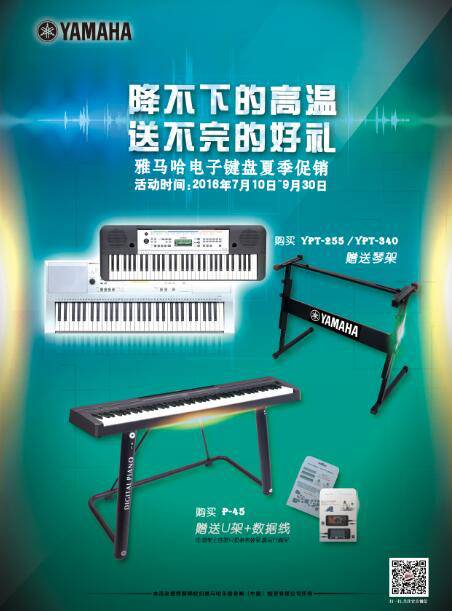 现在,雅马哈电子键盘正在进行夏季促销。从2016年7月10日起,到9月30日,只要购买电子琴YPT-255/YPT-340,即可获赠琴架。