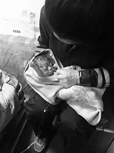 情况紧急,韩娟负责剪脐带和对产妇做消毒清理工作,胡贝贝立即抱起孩子做口腔异物处理等急救工作,急救司机齐庆伟则是“后援队员”,需要什么了就立即跑前跑后去找。