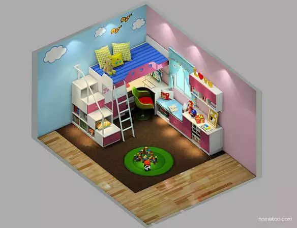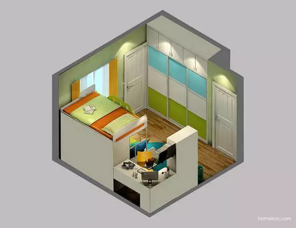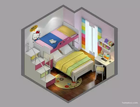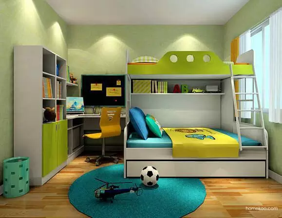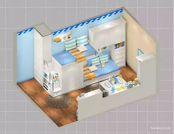 这个房间比较大。布置了一个平行的上下床、书桌柜组合以及一个内嵌式衣柜,中间有较大的空地,可以铺一张地毯供孩子们玩耍。