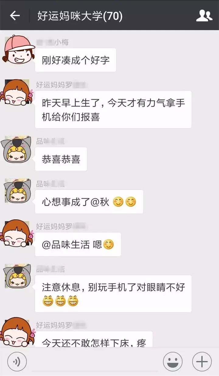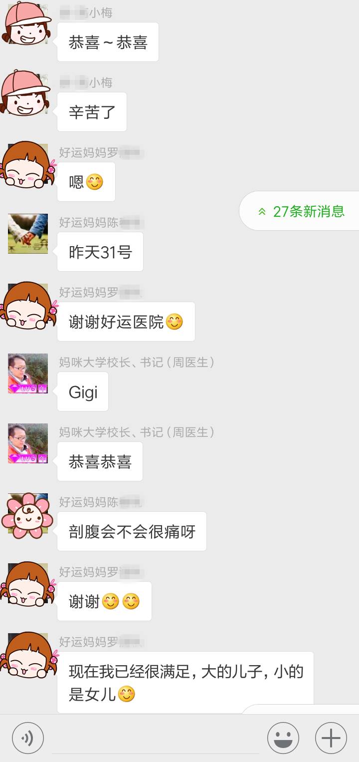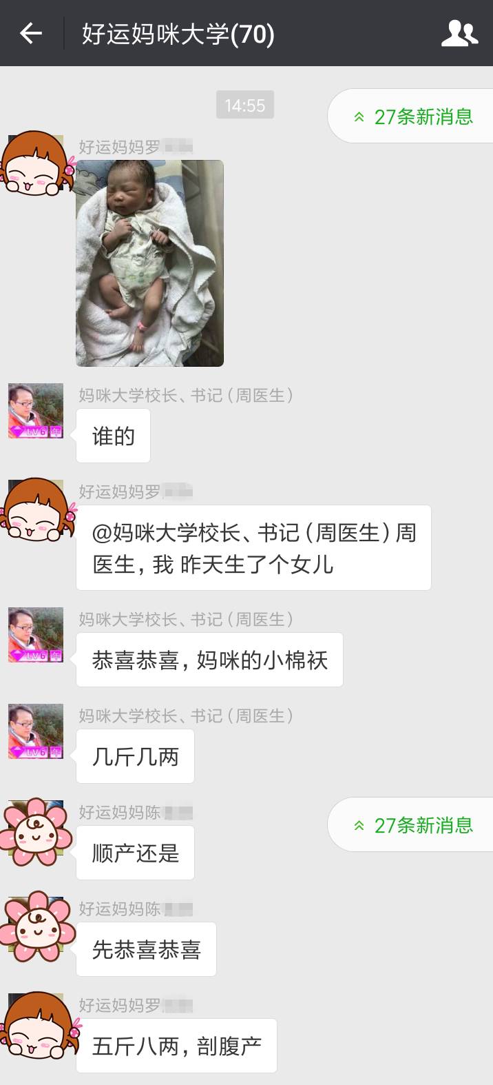 昨日,家住广州花都的罗女士通过微信,在好运妈咪群发来喜讯,自己于8月31日早上成功诞下一枚好运女宝宝。罗女士表示,因为自己是剖腹产,生完宝宝之后体力不支,所以在休养了一天之后才迫不及待地向大家报喜。听闻罗女士产女喜讯之后,我院团委书记周医生第一时间送去了祝福,随后,好运妈咪们也纷纷祝福罗女士喜得千金,并叮嘱其在生产结束后要注意休息。妈咪群里洋溢着十分温馨、和谐、美好、有爱的气氛。