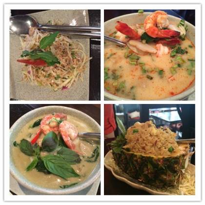 在Mango tree,点了评价都非常高的冬阴功汤(冬阴是酸辣的意思,功是虾的意思,因此得名),绿咖喱虾,青芒果沙拉,菠萝饭,还有芒果冰沙。