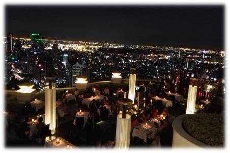 晚餐后,当然就是要去享受夜色的曼谷了,曼谷大概有4家sky bar,每一家都不同特色,我们选择了坐落于河畔的莲花酒店64楼sky bar(必须每个人点酒水,最便宜的342泰铢,会让你先在一个位置点酒水,点好后可以走去sky bar。坐BTS到SaphanTaksin即可前往)。