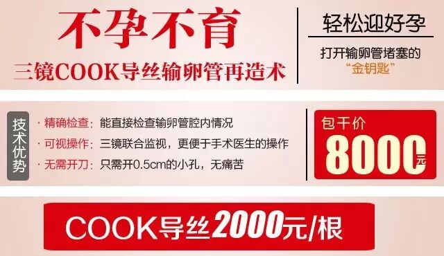 美国COOK导丝,在内窥镜透视下进行直观操作,避免了盲通;治疗时痛苦轻、风险小,对于输卵管间质部和峡部堵塞一次性复通率较高。复通后,可在自然状态下怀孕,某些患者当月即可怀孕。在适应症范围内为目前治疗输卵管不通最有效的治疗方法。