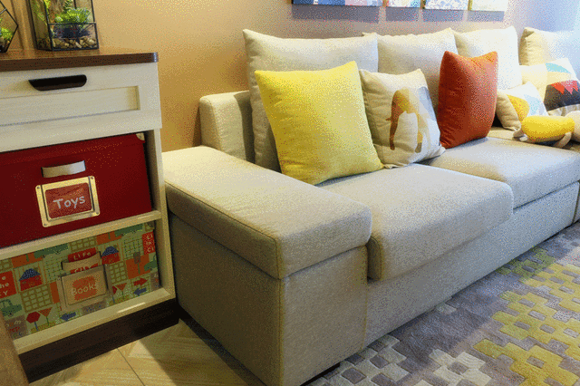扶手处可以储物,反过来可以当茶几。有小孩的家庭因为害怕小孩磕碰到茶几,直接把茶几撤了,可这样一来东西又没地方放。有了这款沙发,一切都搞定了。