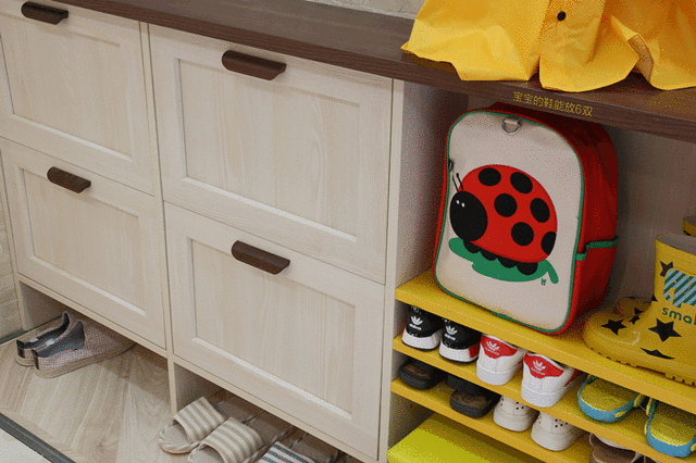 如果你家玄关不够宽,可以考虑做斜放的鞋柜。给孩子准备的鞋柜可以在孩子长大后抽掉隔板,就可以当成正常型号的鞋柜继续使用了。