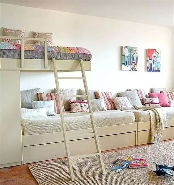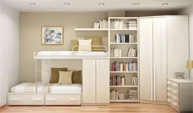 传统的上下床显得呆板,选择这种错落设计,不仅能让宝贝们多一点乐趣,少一份压抑,还能增强两个宝贝的沟通互动,培养感情。这种上下床还可以把书桌、书柜、衣柜一体化设计,增大储物功能,绝不浪费半点空间,只此一间的儿童房实现了更多功能。