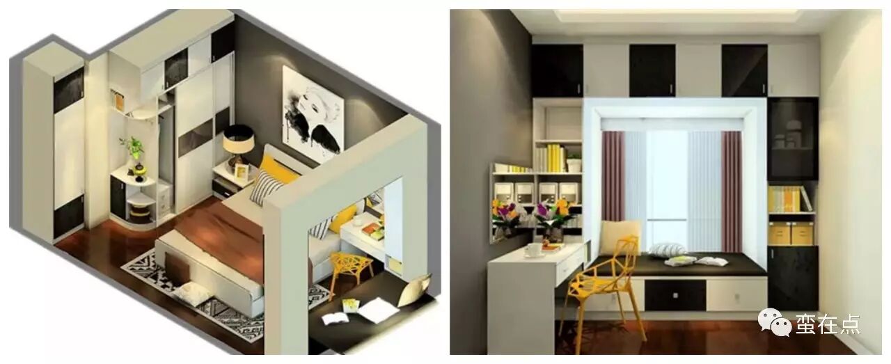 解决方案:榻榻米+飘窗+书柜,科学将三者连接起来,或者放置一个带框的小床,都挺节省空间。