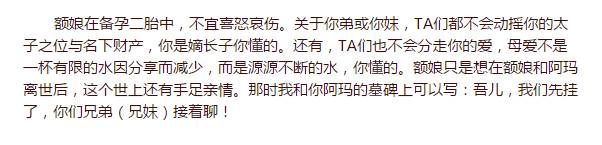 吾妹,额娘于你可谓尽心尽力,本为高龄产妇,为了生你却不顾及自己身体,好在你平安降生。无论是对你,还是对我,额娘都倾尽全力,你尚且幼年恐不理解,有此额娘乃是你我之大幸。