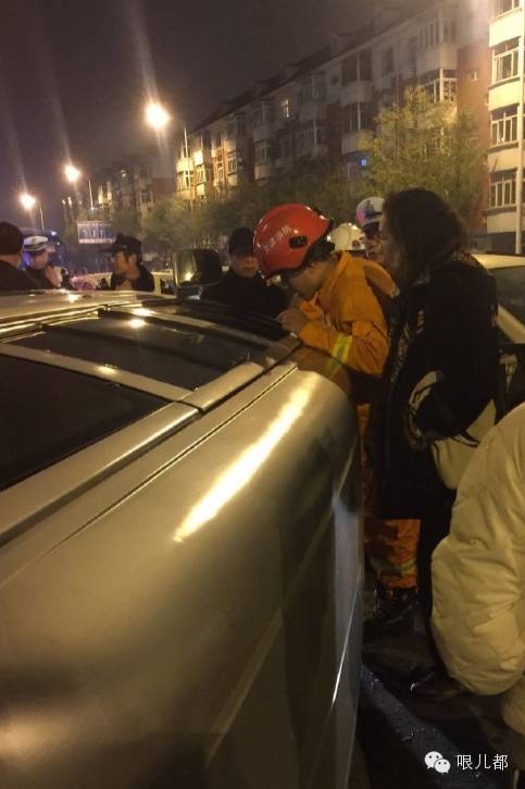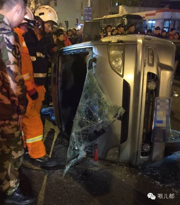 事故现场警车前保险杠受损,涉事车辆侧翻。