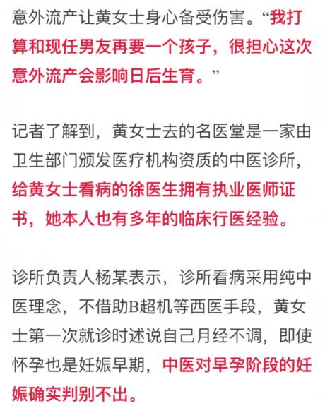 “我们是纯中医,号脉一般是妊娠后3个月才能把出,早孕诊断最准确的是B超,因为当时她提出来上环了,医生没有想到怀孕,我们一直是认可的,医生没有建议验孕,有这方面的缺失。”