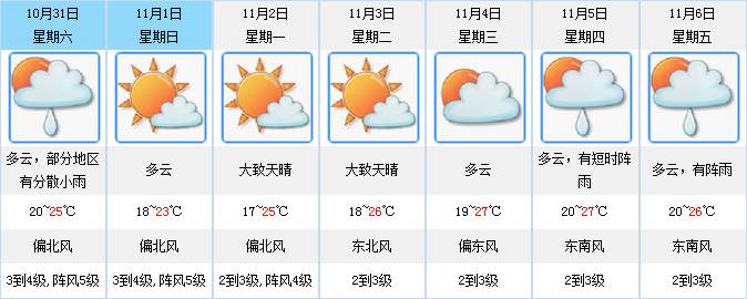 根据气象台发布的最新天气消息:31日至11月2日受中等强度冷空气影响,初时有分散小雨,北风清劲,天气显著转凉;3日至4日气温缓慢回升;5日至6日天空云量增多,间中有阵雨。