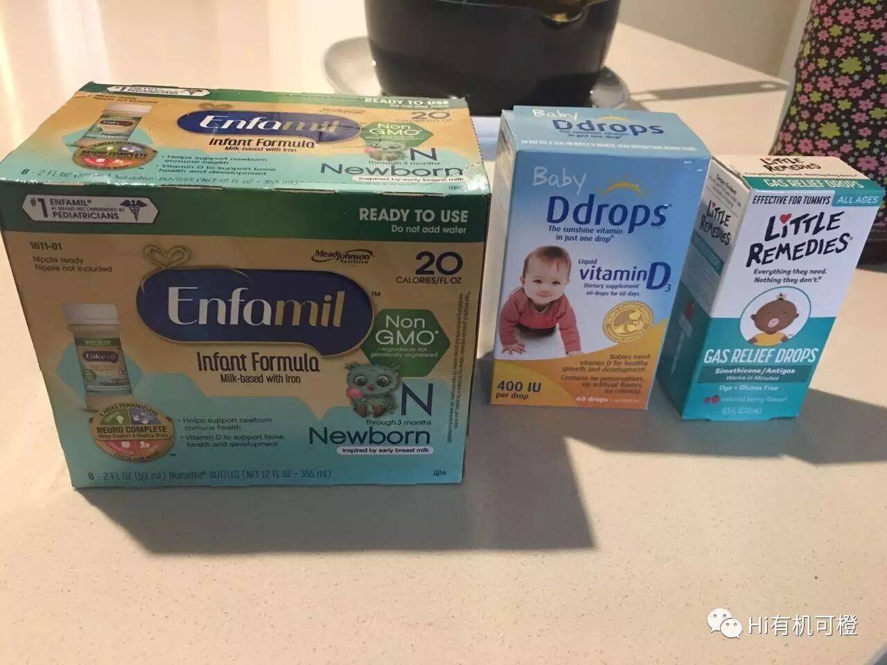 依次是美赞臣新生儿水奶,VD3和防胀气滴剂。后二者是必备,但吃完一瓶VD3后直接换成了伊可新 哈哈