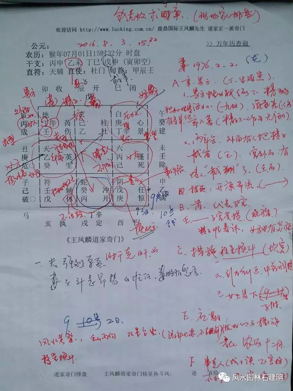 从奇门盘中可以看岀,本宅壬山丙向(座北向南偏东),双星会坐之宅,也就是“丁”,“财”二星均在坐山方。俗话说,山管人丁水管财,所以旺丁位应在坐山方。原卧室在巽宫,今处在“入墓”阶段,能量受制。所以,风水术认为这才是这夫妇迟迟不能受孕的根本原因。现场建议把卧室临时搬迁到北面“坎宫”书房,暂作爱巢催丁求孕。这里“开门”大吉!(坎宫意象)
