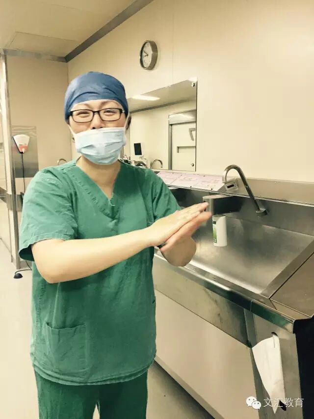 手术前,熊瑛在洗手,由于消毒剂成分的影响,很多外科医生的手臂会泛起白屑,脱皮。