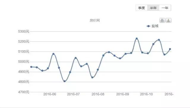 2016年最近半年盐城房价走势图, 截止2016-10-30二手房均价:5125元/平米,按100平米,按揭30年来算,每月计算还款:1903.98元