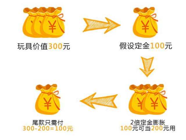 什么是定金膨胀?就是所付的定金在付尾款时可抵更高的金额使用,举个栗子: