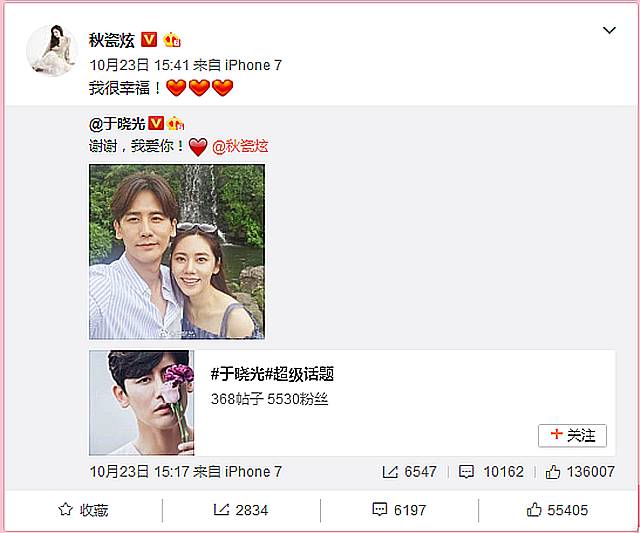 于晓光也上微博分享了喜讯~俩人都很幸福!