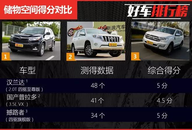 而汉兰达与撼路者更是得到了5分满分,只有国产普拉多缺失了卡票收纳盒没有得到0.5分的加分,而其余两款车都具备了这个人性化的设计,此外三款车都具备了专用眼镜盒,故全部得到了另外一个0.5分的加分。