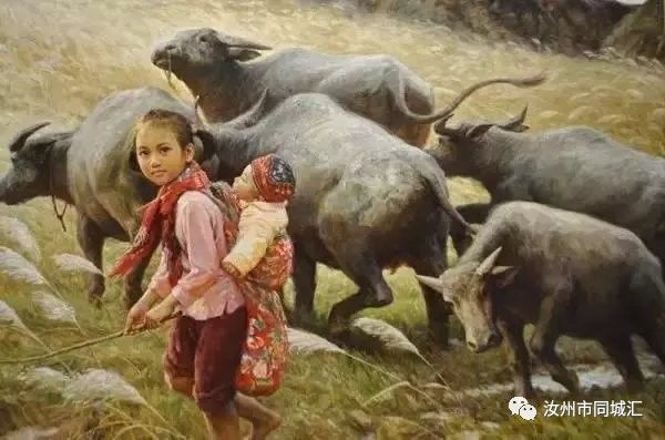 姐姐背着弟弟看牛,偶尔还唱个小童谣,很温馨的画面