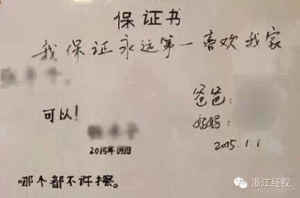 近日,网友“滴答”在网上晒出一张《保证书》,她和老公向女儿保证:我保证永远第一喜欢我家大宝。女儿在下面签字“可以!”然后女儿、父母双方签名、写保证日期。不仅是“滴答”,很多想要二宝的夫妻,都遇到了同样的问题。