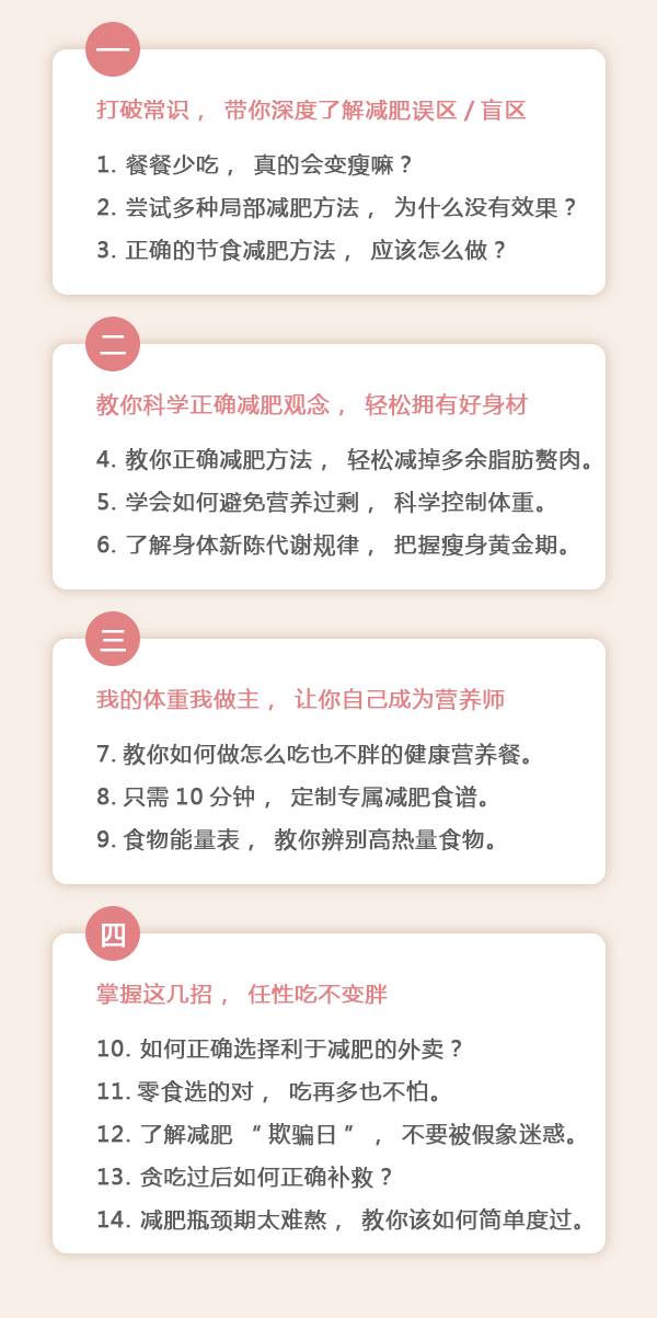 为了让更多的人能够从科学的减肥方法受益,平衡好减肥和吃之间的关系,我开设了14节可以永久保存、随时回放的课程,讲解营养知识、瘦身餐制作和体控方法,一朝学习,终生受用。