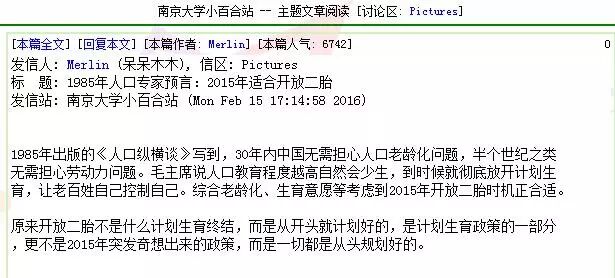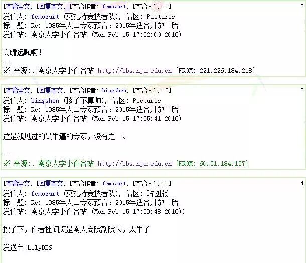 昨晚,南大小百合BBS(bbs.nju.edu.cn)爆出一条热帖《1985年人口专家预言:2015年适合开放二胎》,引发众学子跟帖膜拜,一时间,“牛B”、“大神”、“高瞻远瞩”等评论不绝于耳。