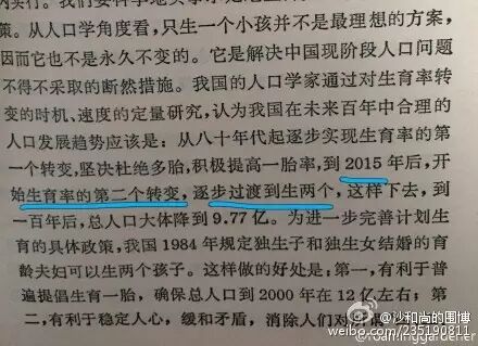 “我国人口学家通过对生育率转变的时机、速度的定量研究,认为在未来百年中合理的人口发展趋势应该是:从八十年代起逐步实现生育率的第一个转变,坚决杜绝多胎,积极提高一胎率。到2015年后,开始生育率的第二个转变,逐步过渡到生两个,这样下去,到一百年后,总人口大体降到9.77亿。”