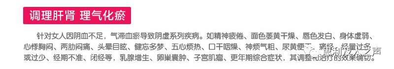 1、针对女人因阴血不足,气滞血瘀导致阴虚系列疾病,如精神疲倦、面色萎黄干燥、唇色发白、身体虚弱、心悸胸闷、两肋闷痛、头晕目眩、健忘多梦、五心烦热、口干咽燥、神烦气粗、尿黄便干、痛经、经量过多或过少、经期不准、闭经等,乳腺增生、卵巢囊肿、子宫肌瘤、更年期综合症状,其调整和治X的效果确切。