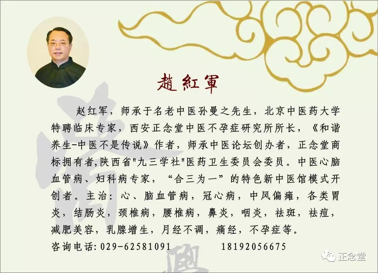 西安中医赵红军国医馆,致力于开创“合三为一”的特色新中医馆模式:内科、妇科、杂症三合一;中药、针灸、耳疗三合一;门诊、教学、科研三合一。赵红军老师主治心脑血管,脾胃,颈椎腰椎,月经不调,不孕症等内,妇科疾病。赵红军老师被北京中医药大学特聘为临床专家,常年免费带教中医学员。更多中医资讯,请点击关注上方蓝色字“正念堂”。
