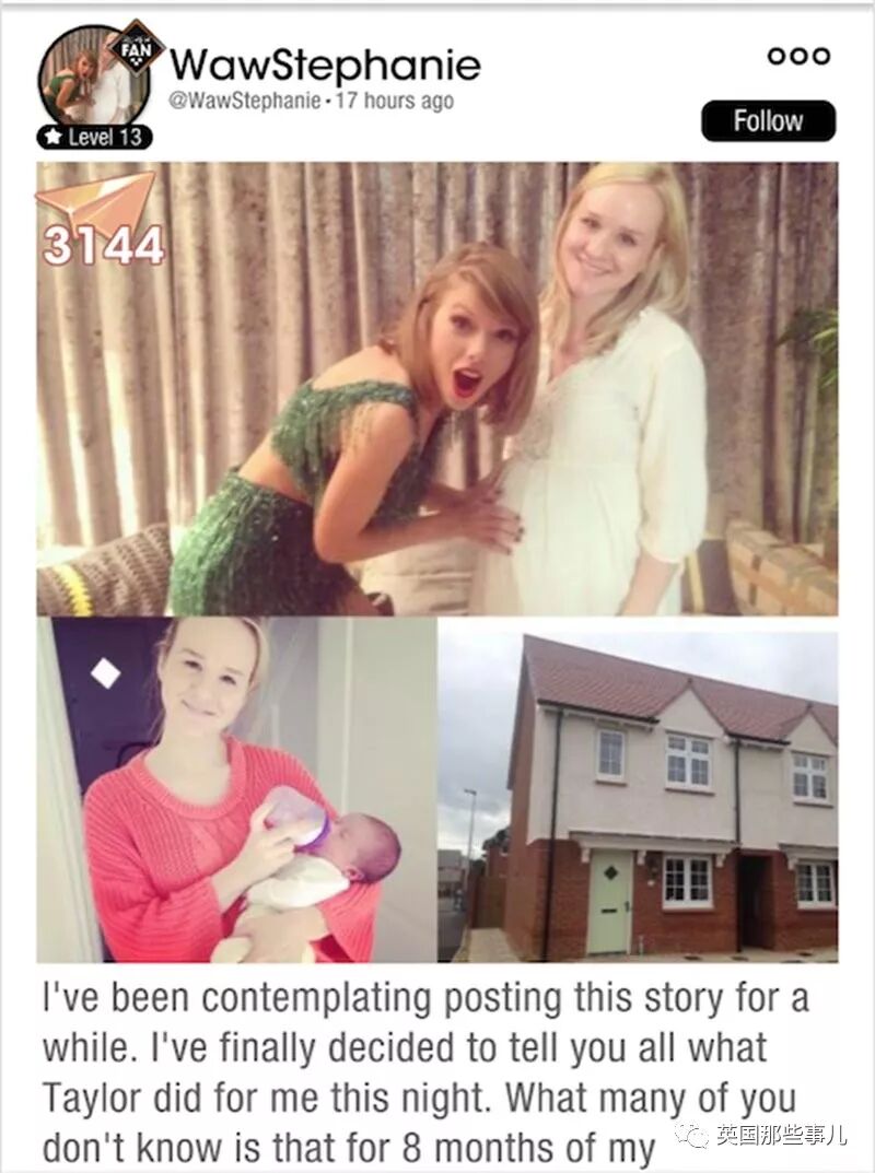 这名粉丝叫Stephanie,她表示之前有一段时期自己过得非常困难,她当时怀孕8个月,丈夫失业,又因为种种原因失去了房子,一下子变得无家可归。