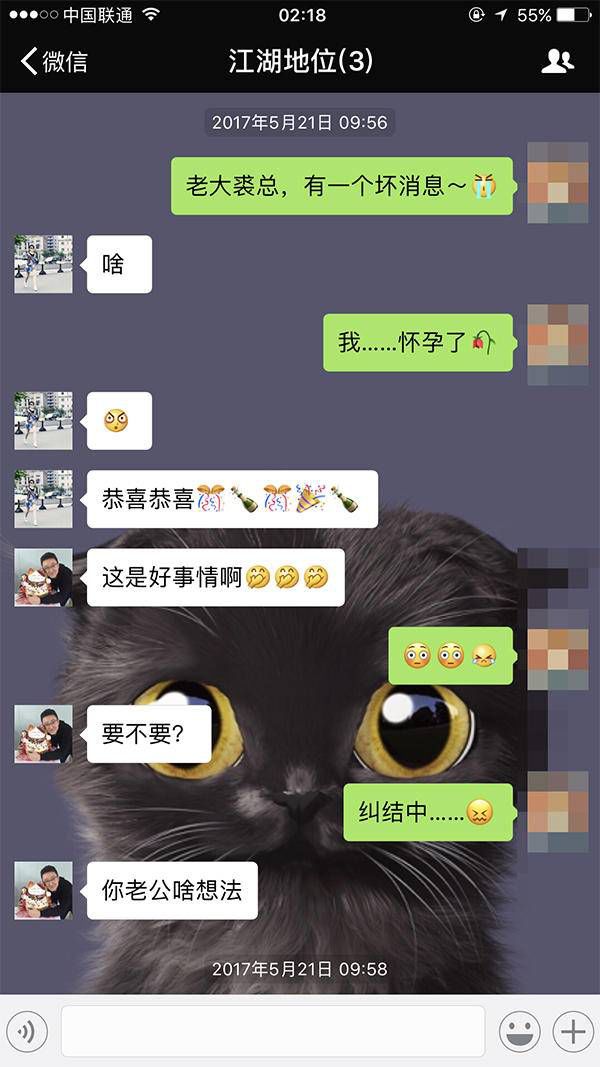 在得知自己意外怀孕之后,刘涛女士第一时间告知了李宇欣和裘实。当天适逢周日,在三人的群里他们问刘涛女士“是打算要还是不要?你老公有什么想法?”刘涛女士回复“正在纠结,但是老公很想要。”随后他们建议刘涛女士留下这个孩子,并且表示了祝贺。