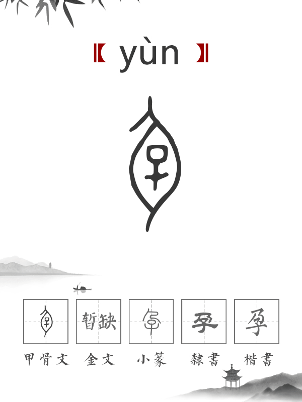 甲骨文象母体中有胎儿的样子。到小篆时,怀孕的形象不明显,变为与「子」和「乃」有关,「子」表示胎儿,「乃」表示简化了腹部的母体形象。到隶书时,书写进一步简化,隶变楷后写作「孕」。