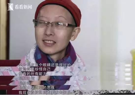 老公心痛无比,也许是想到了回家的孩子,她却乐观得让人心痛,带着笑意讲:“我老公弱爆了。至少现在这个眼睛还是很好的,就觉得要珍惜自己拥有的所有能力。包括说话,包括听,包括大脑正常的思维。我现在得放低所有要求去知足,是不是挺棒的。”