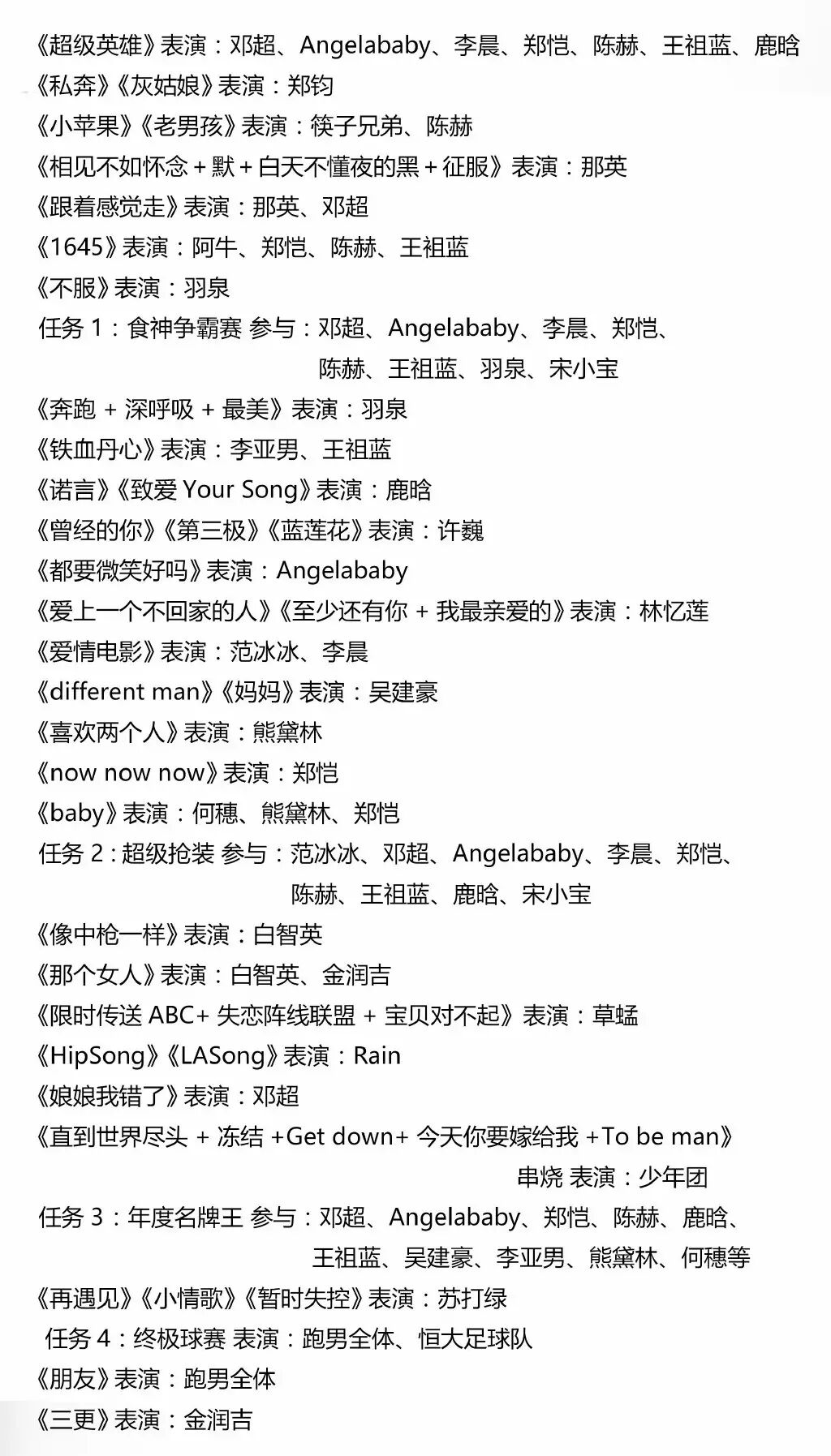 Angelababy 鹿晗 李晨 陈赫 王祖蓝 郑恺 邓超 范冰冰 水原希子 熊黛林 李亚男 何穗 那英 林忆莲 白智英 许巍 郑钧 阿牛 金润吉 苏打绿 吴建豪 羽泉 筷子兄弟 草蜢
