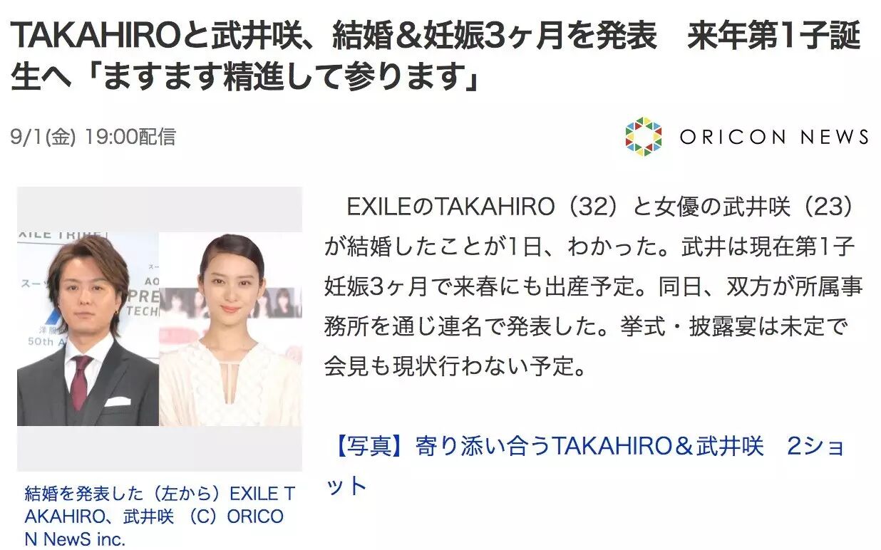 9月1日,武井咲和EXILE的主唱之一TAKAHIRO发布公告,两人已登记结婚。同时,已经怀有赤ちゃん,预计明年春天家里将增加新成员。在感谢粉丝的关心和支持外,也为之前未公开这个消息而表达歉意。