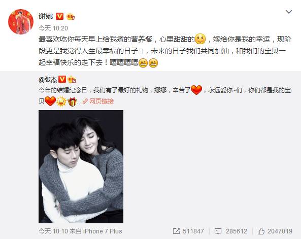 谢娜转发此条微博并秀恩爱:“最喜欢吃你每天早上给我煮的营养餐,心里甜甜的,嫁给你是我的幸运,现阶段更是我觉得人生最幸福的日子,未来的日子我们共同加油,和我们的宝贝一起幸福快乐的走下去!嘻嘻嘻嘻~”