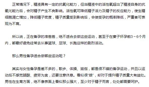 很多准备要宝宝的男性朋友,在怀孕前都会有意识地加强体育锻炼,以求改善精子质量。对于男性备孕而言,适当的体育锻炼是非常必要的,可以增强体质,为生产高质量精子提供良好的身体基础。但是大家在备孕过程中,对于如何体育锻炼往往缺乏一个正确的认识,有时甚至适得其反。