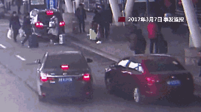 13时45分46秒,红色轿车撞上人行道旁的金属护栏后停了下来,有一名行人被撞得越过护栏坠下。