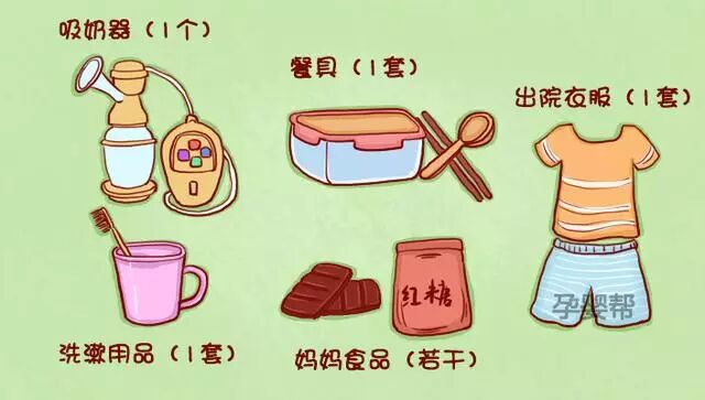 妈妈食品(若干):可提前准备好红糖、巧克力等食品。巧克力可用于生产时增加体力,红糖是产后补血之用。