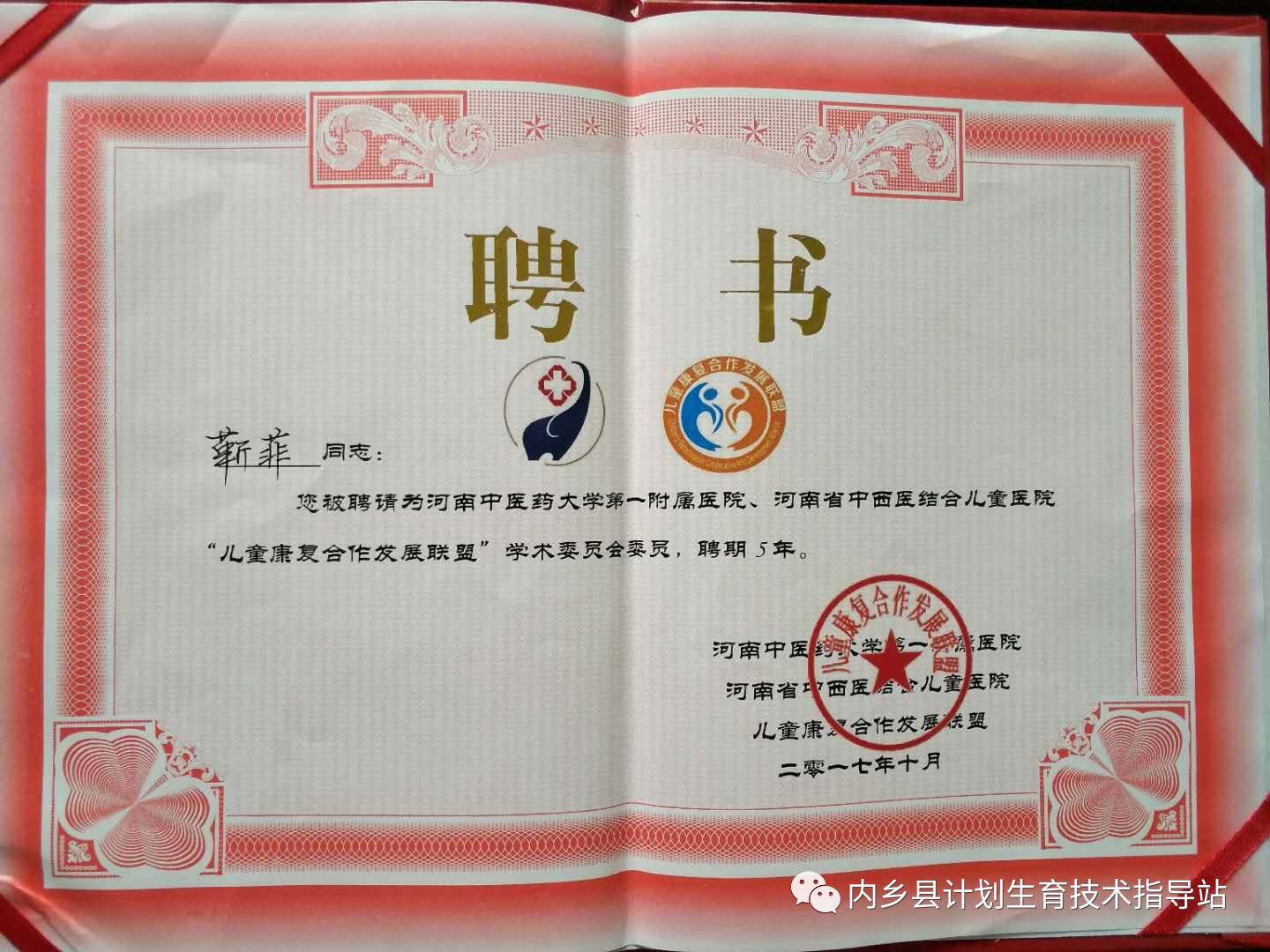 靳菲主治医师受聘为“儿童康复合作发展联盟”学术委员会委员!
