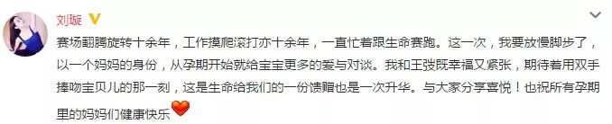 刘璇4月23日晚间发文分享自己的怀孕喜悦,她写道,“赛场翻腾旋转十余年,工作摸爬滚打亦十余年,一直忙着跟生命赛跑。这一次,我要放慢脚步了,以一个妈妈的身份,从孕期开始就给宝宝更多的爱与对谈。我和王弢既幸福又紧张,期待着用双手捧吻宝贝儿的那一刻,这是生命给我们的一份馈赠也是一次升华。与大家分享喜悦!也祝所有孕期里的妈妈们健康快乐。”
