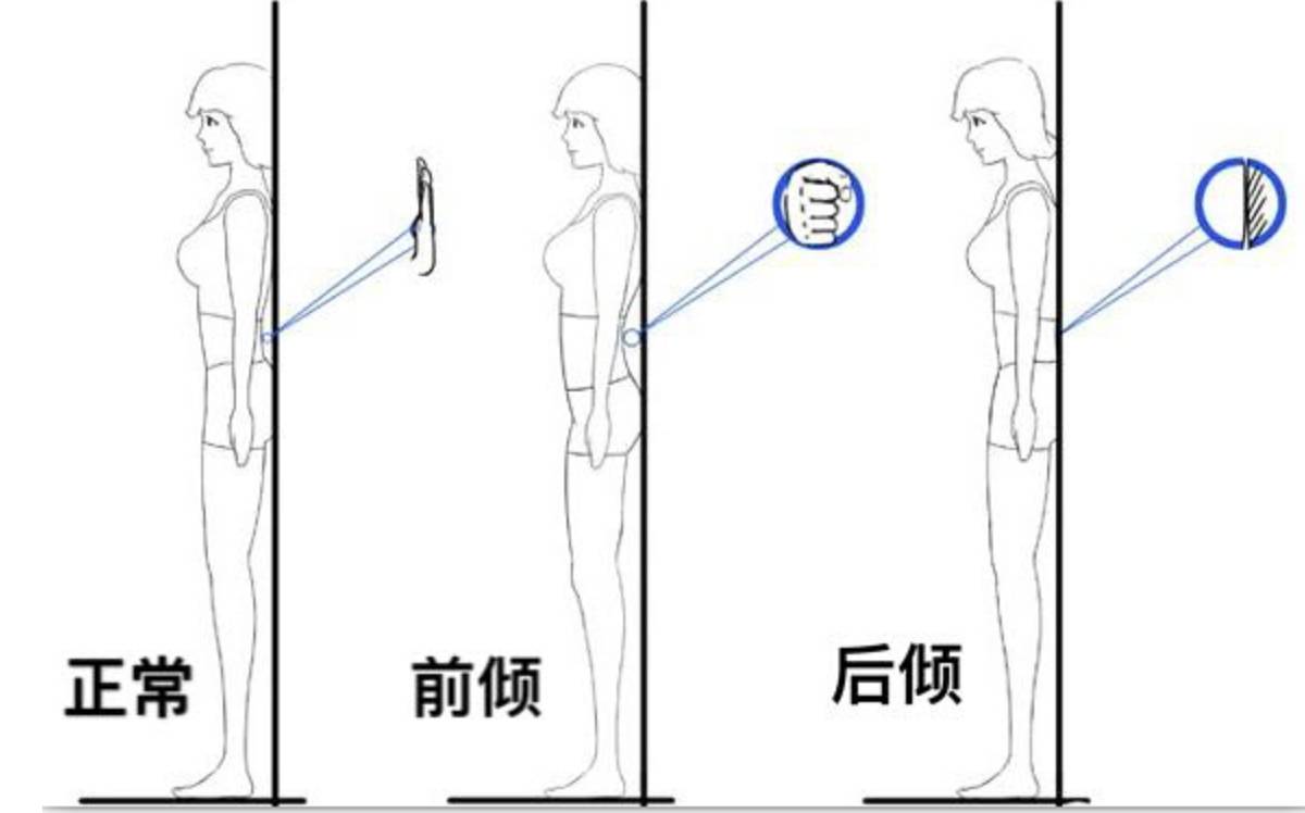 正常状态下,后腰与墙面之间正好能塞下一个手掌,如果距离大于手掌的宽度,甚至能塞下拳头,那你的骨盆就是前倾了(天生翘臀请自动忽略)。