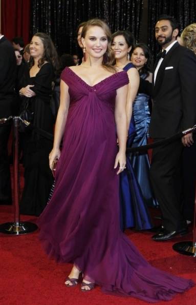 女神娜塔莉波特曼正确示范:深V领的紫色礼服优雅度满分,衣面上的聚集线条让她显得更为纤长。